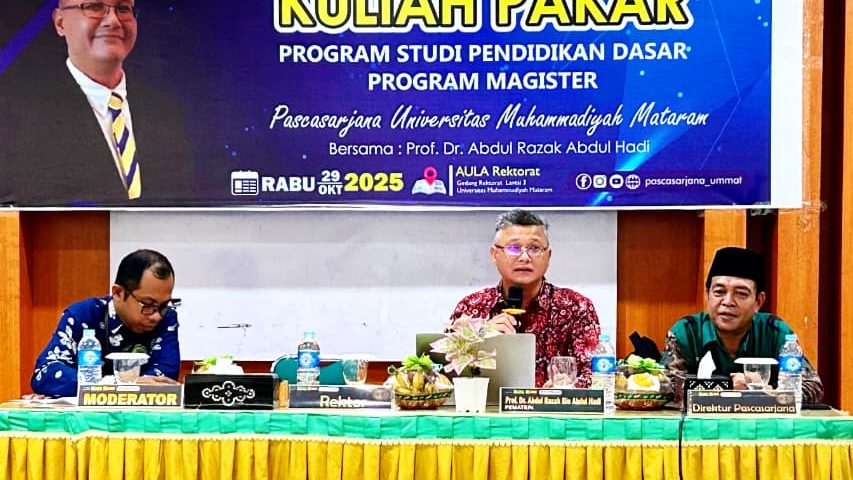 Mataram, Program Studi Pendidikan Dasar Pascasarjana Universitas Muhammadiyah Mataram (UMMAT) kembali menegaskan komitmennya dalam meningkatkan kualitas pendidikan dan memperluas jejaring akademik internasional melalui penyelenggaraan Kuliah Pakar Internasional bertema “Sustainability Management and Future Growth”, pada Rabu, 29 Oktober 2025, bertempat di Aula Pertemuan Lantai 3 Rektorat UMMAT. Kegiatan ini menghadirkan Prof. Dr. Abdul Razak Abdul Hadi, Guru Besar dari Universiti Kuala Lumpur, Malaysia, sebagai narasumber utama.