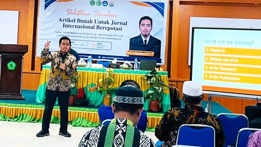 Mataram — Lembaga Penelitian dan Pengabdian kepada Masyarakat (LPPM) Universitas Muhammadiyah Mataram (UMMAT) melaksanakan Pelatihan Penulisan Artikel Ilmiah untuk Jurnal Internasional Bereputasi dengan tema Smart Research and Publishing: Optimalisasi Artificial Intelligence dalam Penulisan Artikel Ilmiah Internasional, pada Rabu (28/1/2026). Kegiatan ini diselenggarakan di Ruang Pertemuan Lantai 3 Rektorat UMMAT dan diikuti oleh dosen serta peneliti dari berbagai fakultas di lingkungan UMMAT.