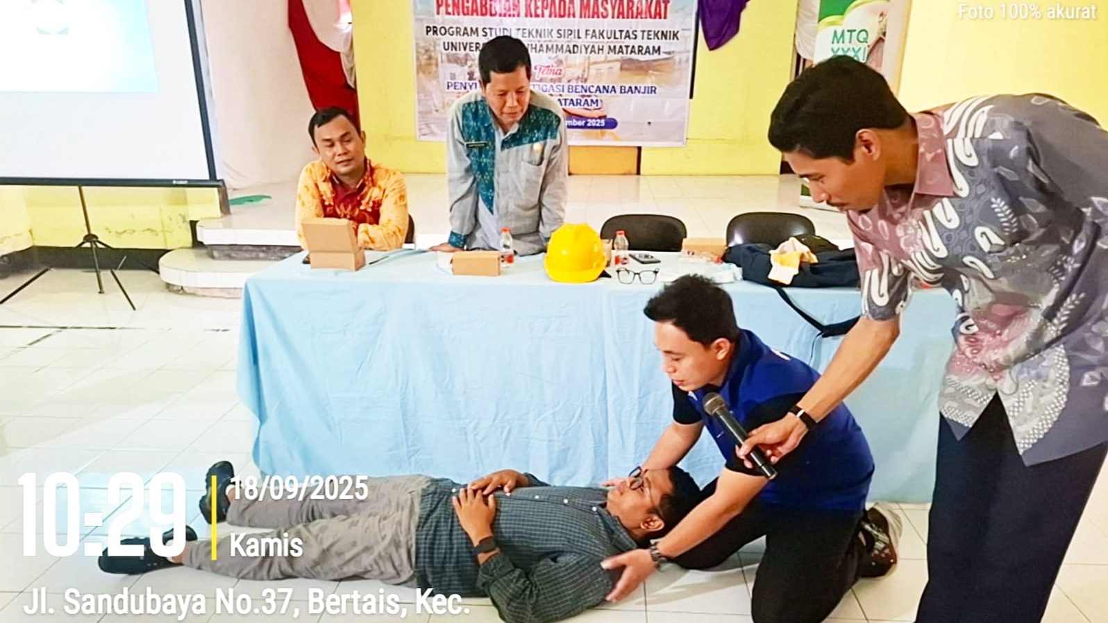 Mataram, Program Studi Teknik Sipil Fakultas Teknik (Fatek) Universitas Muhammadiyah Mataram (UMMAT) gelar kegiatan Pengabdian kepada Masyarakat berupa Penyuluhan Mitigasi Bencana Banjir di Kantor Lurah Bertais, Kecamatan Sandubaya, Kota Mataram pada 18 September 2025. Kegiatan ini diikuti oleh masyarakat Kelurahan Bertais dengan melibatkan seluruh dosen Prodi Teknik Sipil UMMAT.